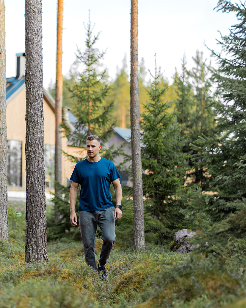 Miesten collegehousut harmaa – syvät taskut puhelimelle ja avaimilleArki-collegehousut harmaana käytössä – rento istuvuus vapaa-aikaan